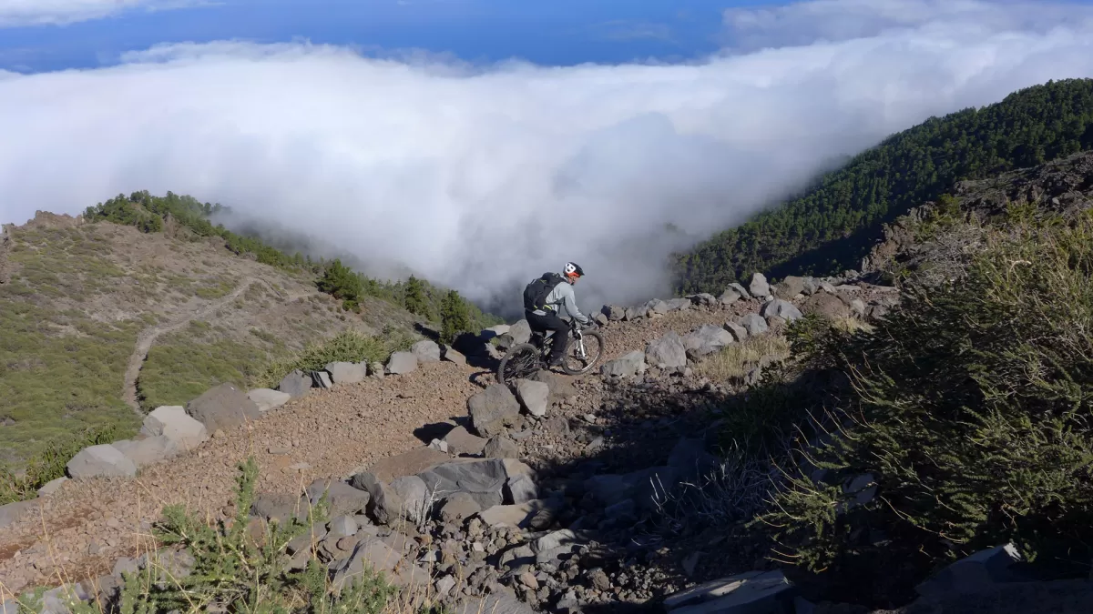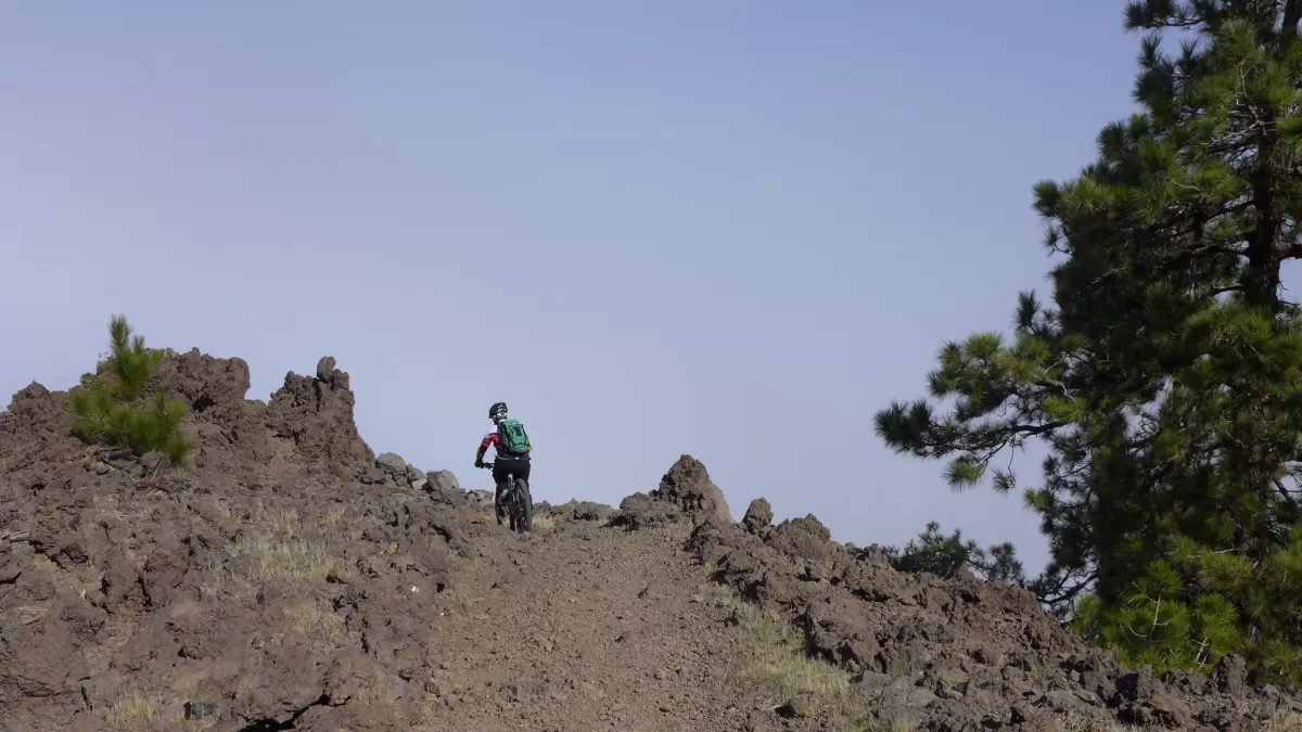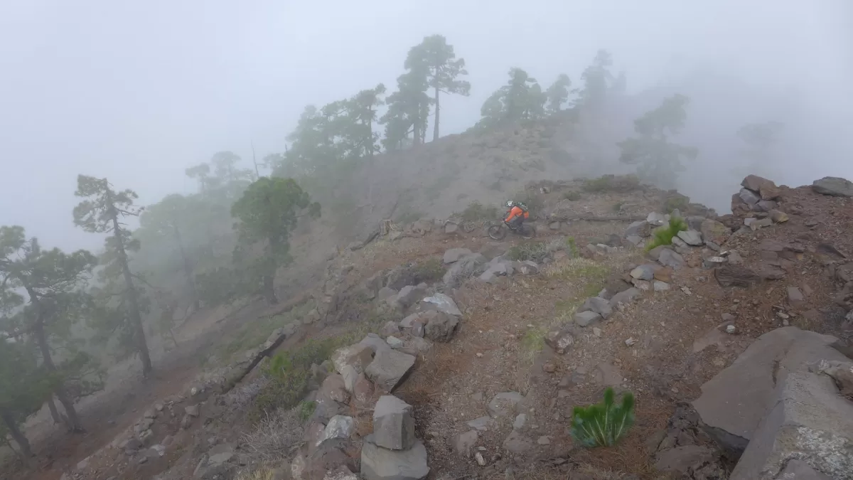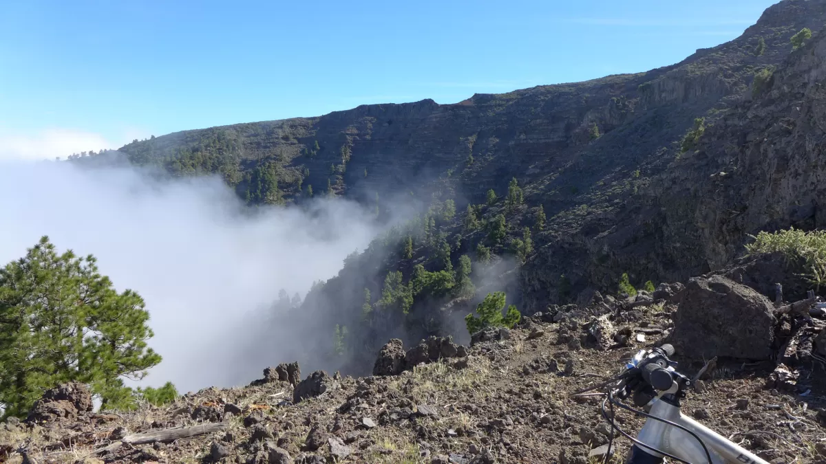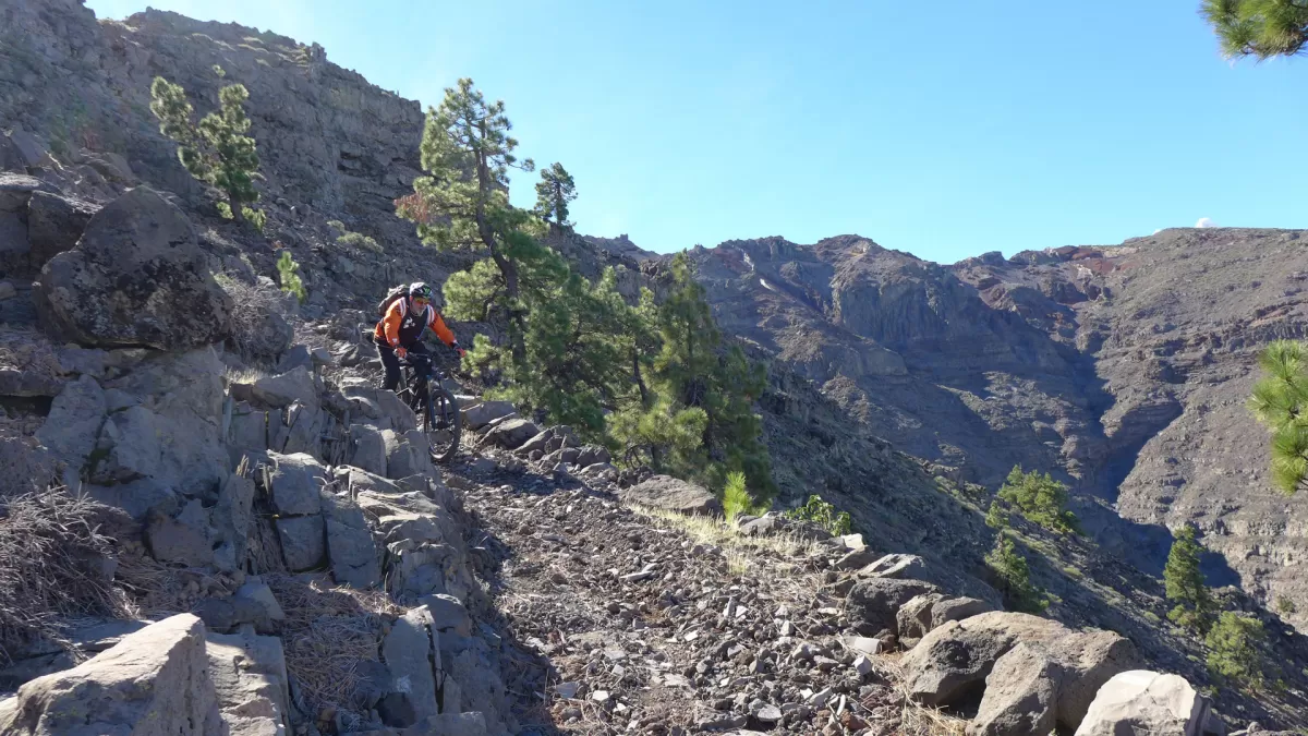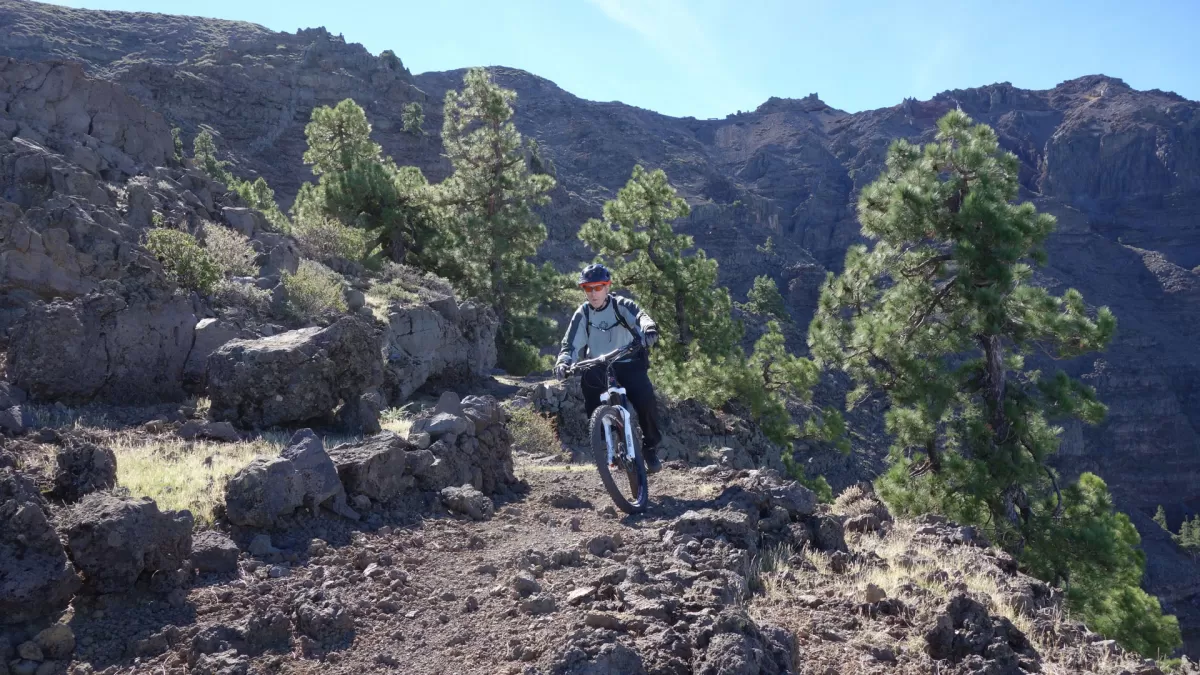 Mit dem Shuttle gehts hoch zum Mirador de los Andenes. Den Panoramablick in den Krater Caldera de Taburiente sollte man sich nicht entgehen lassen. Ein anspruchsvoller, ruppiger Downhill im oberen Teil und ein fänomenaler, flowigen zweiten Teil bis nach Roque Faro. Weiter via La Mata nach Santo Domingo de Garafie im Norden von La Palma.