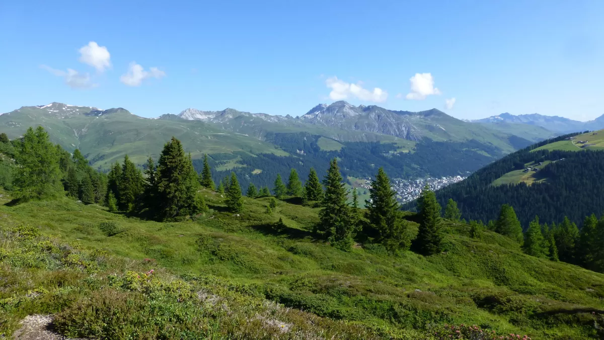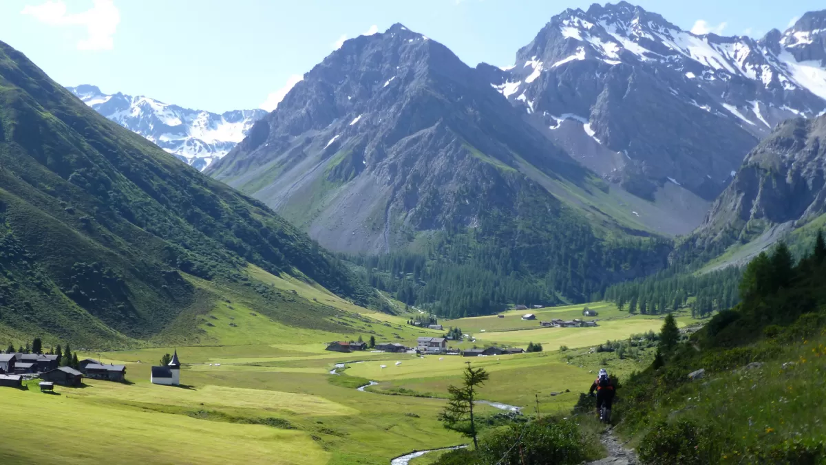 Ein sensationell schöner Singletrail führt vom Rinerhorn nach Sertig-Dörfli. Und das Bergpanorama darf sich auch sehen lassen.